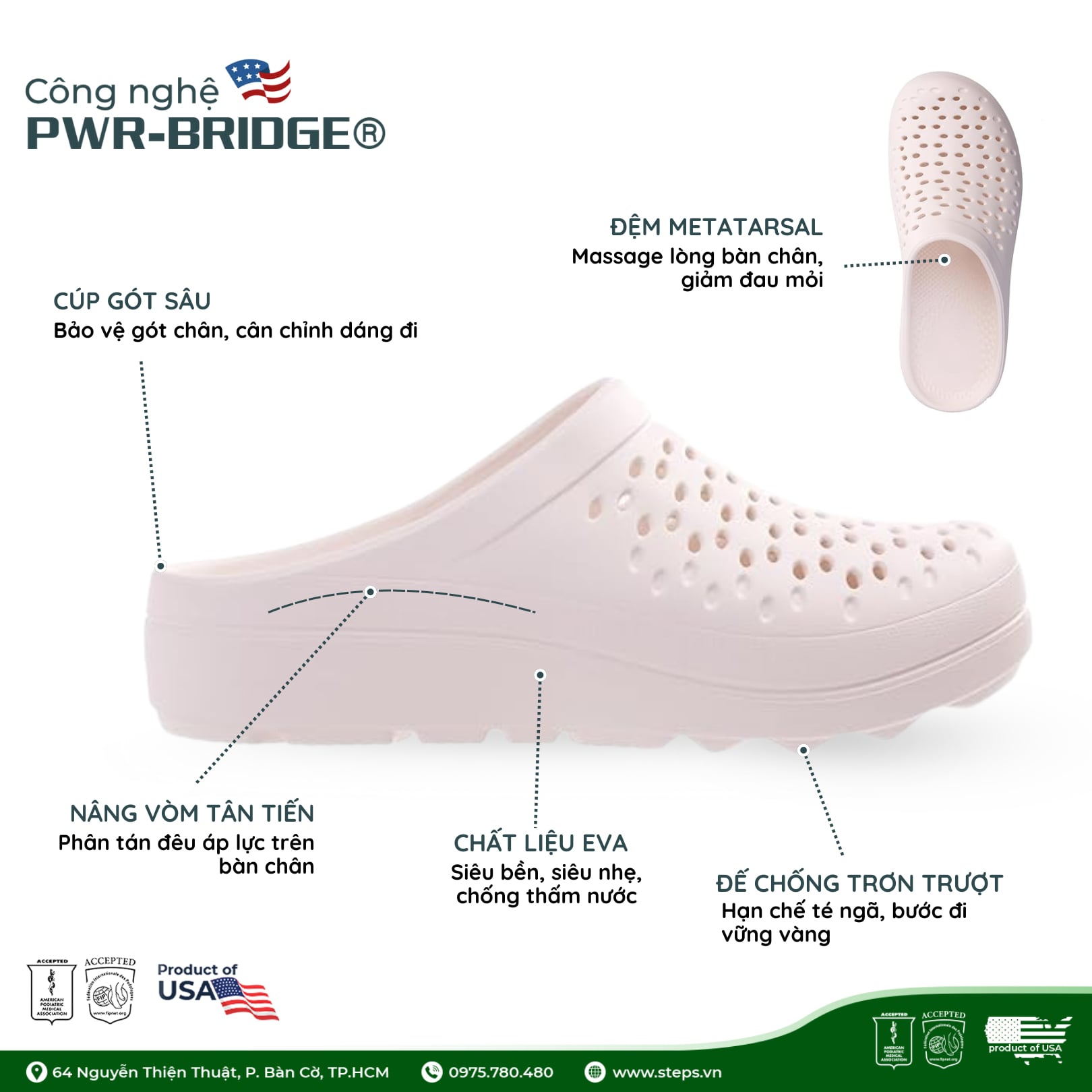 Khung đế chỉnh hình hỗ trợ xương vòm bàn chân, cấu trúc đế phù hợp với hầu hết các kiểu vòm chân, phòng và giảm một số triệu chứng đau thường gặp ở bàn chân giúp giảm áp lực cho bàn chân, giảm đau gót, viêm cân gan chân, đau gân achilles, đau banh bàn chân, đau do SDTM ... hiệu quả